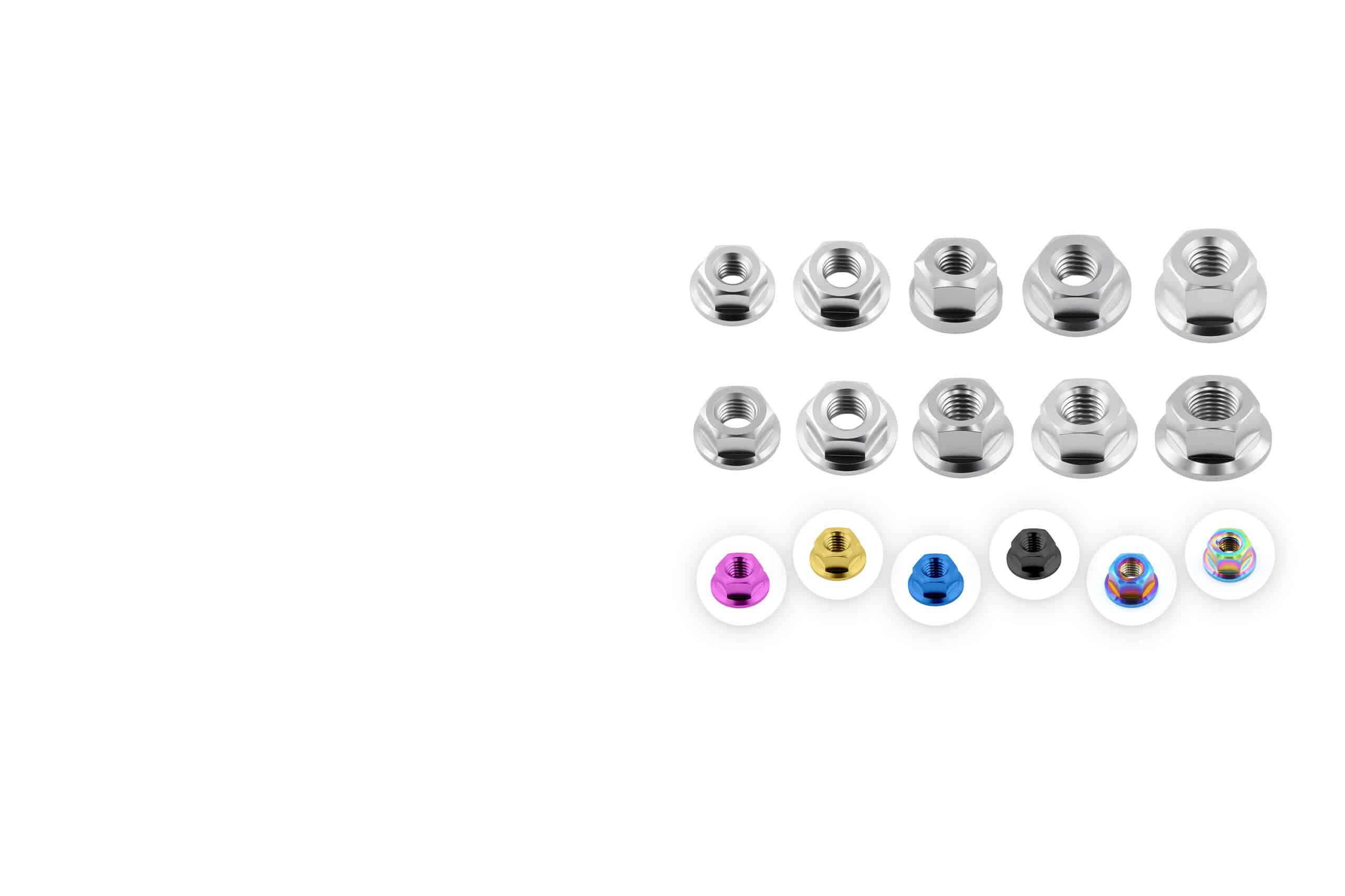 TRT provides metric flanged hex ti-nut from M3 to M20 with different size. In order to satisfy various applications, especially in bicycle, motorcycle, sporting devices.
